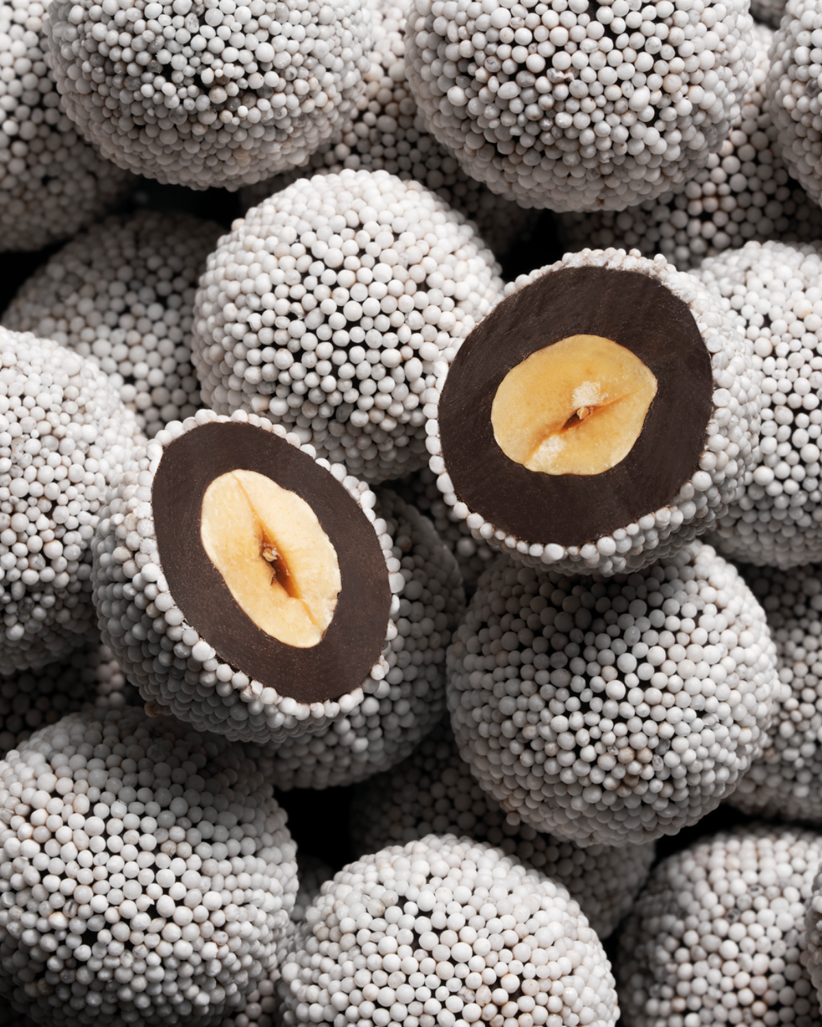 Ingrédients : chocolat noir (minimum 60% de cacao) (pâte de cacao, sucre, beurre de cacao, émulsifiant : lécithine de soja), noisette du Piémont IGP (16%), sucre, amidon de maïs, cacao en poudre, glucose, maltodextrines de maïs, extrait naturel de vanille Bourbon.