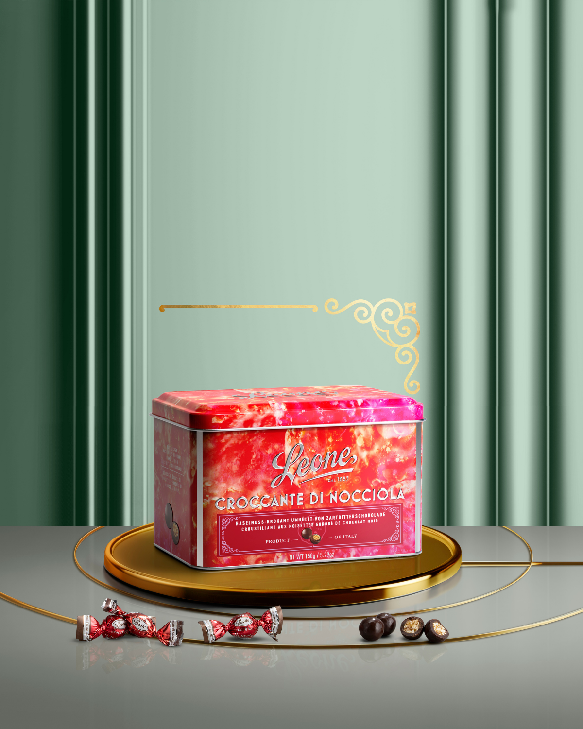 Un coffre au trésor raffiné qui renferme des délices précieux : d'irrésistibles croquants de noisettes enrobés d'un délicieux chocolat noir.