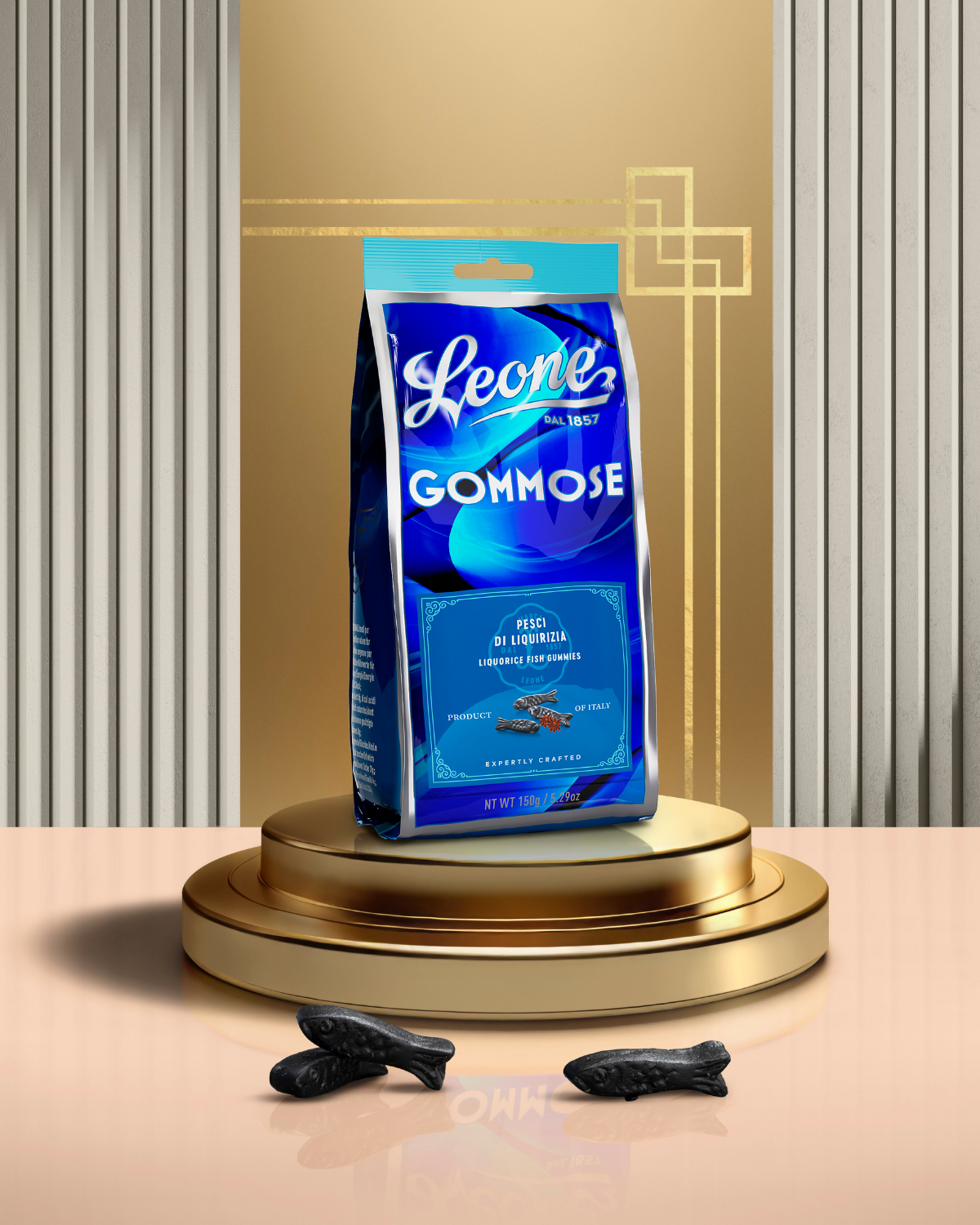 Un sachet refermable élégant et pratique avec des petits gummies à la réglisse en forme de poisson, un océan de bonté avec un arrière-goût anisé.