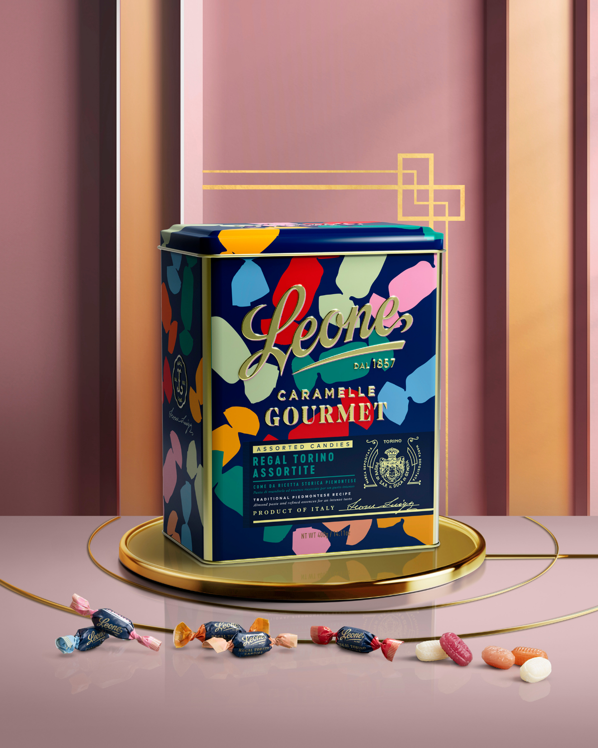 Come da tradizione, la pasta di mandorle si stringe in un dolce abbraccio con estratti e succhi naturali, un incontro dai sapori sorprendenti all'interno di una latta raffinata.