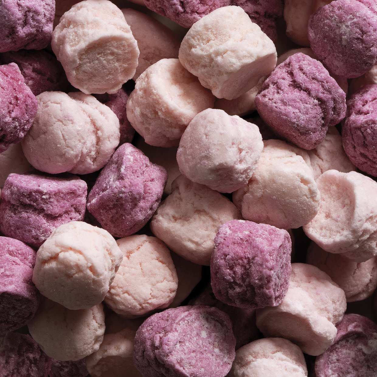Zutaten: Zucker. Verdickungsmittel: Gummi arabicum, Tragantgummi. Feuchthaltemittel: Glycerin. Erdbeersaft, Himbeere, Blaubeere, Aromen. Säuerungsmittel: Weinsäure. Natürlicher Farbstoff: Anthocyane.